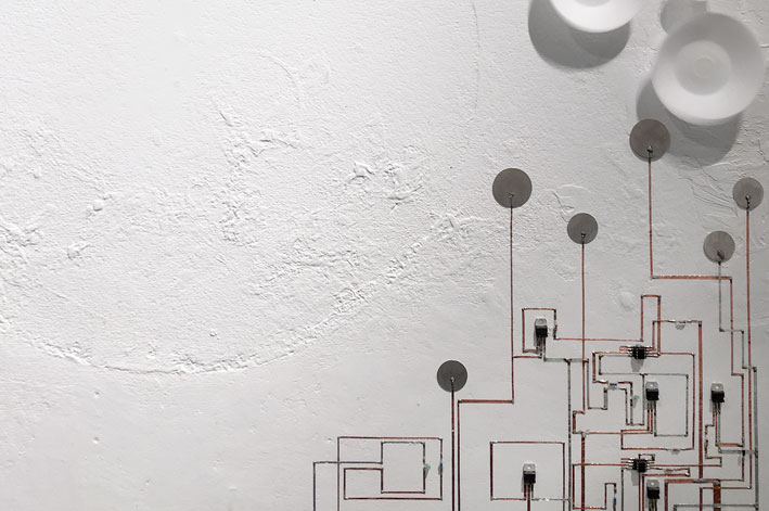 Andere Monde, andere Rubriken Kinetische Zeichnung, ca. 90 x 240 cm, 2017 Spanplatte, Lack, Kupfer- und Aluminiumklebeband, Papier-Muffinförmchen, Motoren, Elektronik |