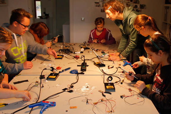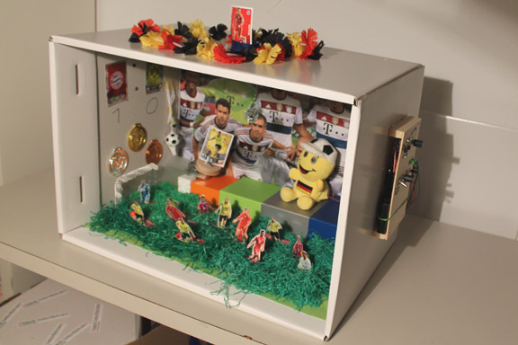 | MUSEOBIL-BOXEN Jugendkunstschule Schmallenberg, 2014 "MuseobilBOX- Museum zum Selbermachen" ist ein Projekt des Bundesverbandes Museumspädagogik e.V. „Was aus meinem Leben sollte in einem Museum für die Menschen in der Zukunft aufbewahrt und präsentiert werden?“ Mit diesem aufsuchenden Impuls gestalten Kinder und Jugendliche innerhalb und außerhalb des Museums eine mobile MuseumsBOX. Sie beschäftigen sich mit Objekten aus Vergangenheit und Gegenwart, mit fremden Kulturen oder vergangenen Techniken. Sie lernen die Arbeitsmethoden des Museums – das Sammeln, Bewahren, Erforschen, Ausstellen und Vermitteln – kennen. Die Kinder und Jugendlichen sollen Spaß am Museumsbesuch entwickeln, Bezüge zwischen dem eigenen Leben und dem Museum herstellen und Möglichkeiten der kreativen Gestaltung erproben. Abschließend bestücken und gestalten die jungen Menschen unter fachkundiger Anleitung von Museumspädagogen eine mobile Museumsbox. Ziel ist es, den jungen Museumsneulingen Freude am Museumsbesuch zu vermitteln und sie zu ermuntern, das Museum zu einem Ort in ihrer Lebenswelt zu machen. (Beschreibung auf der Webseite http://www.museobilbox.org/ ) Bei dem Workshop in Schmallenberg habe ich mit den Kindern ein paar elektronische Hilfsmittel gelötet (blinkende LED- Beleuchtung und Steuermodule für kleine Getriebemotoren) und ihnen geholfen, geeignete Mechaniken für ihre speziellen Ideen zu realisieren. Die Schalter und Drehregler, um die Elektronik anzusteuern, wurden dann außen an der jeweiligen Box befestigt. Entstanden sind sehr unterschiedliche individuelle kleine Welten. siehe Fotos weiter unten. ![]() ![]() ![]() Ein paar Ergebisse: "Natur der Welt" mit sich drehender Sonne und auf- und ab fliegender Wolke: ![]() ![]() "Im Fußballstadion" mit Discokugel, Flackerlicht, Dreh-Pokal und Fan-Gesängen: ![]() "Kirmes" mit drehendem Riesenrad und Spieluhr, deren Kurbel jetzt nicht mehr manuell gedreht werden muss, sondern auf Knopfdruck von einem Motor bewegt wird: ![]() |